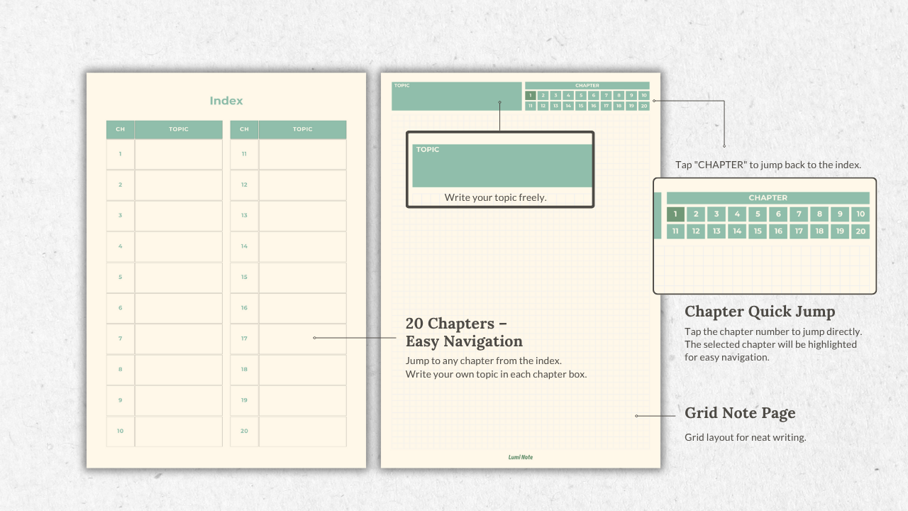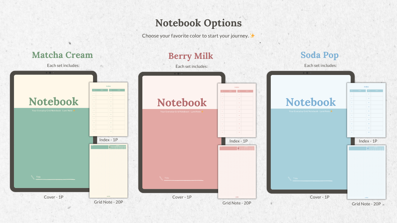 You'll get digital grid notebook (PDF) with cover, index, 20 linked pages – for GoodNotes and everyday planning.